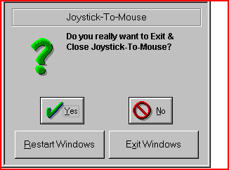From the Joystick-To-Mouse menu, select Exit to stop Joystick-To-Mouse operation, and close the Joystick-To-Mouse program. Joystick-To-Mouse verifies the selection.