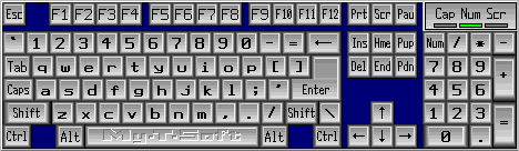 To use combination keys i.e. Shift, Alt, or Ctrl just click on that key. Your cursor will change and My-T-Soft will display which key is currently locked. For example, if you have clicked on the Alt key, the cursor will have the word Alt visible. The lock will be released after you click on a normal key, i.e. A-Z keys. You may carry more than one combination key at a time.