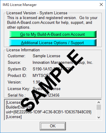To quickly and easily license the software (on a system that has internet access), simply click on the "Retrieve System License" button. Once connected to IMG's website, you can use your existing Build-A-Board.com account, or you can select the type of License you wish to purchase. Once paid, your order will be processed, and you will receive a confirmation e-mail and a separate e-mail with license information. Once the order is fully processed, you can then click the "Retrieve System License" button to automatically license your system.