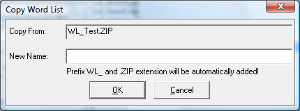 You can copy an existing word list to a different word list. Simply enter the new name (the WL_ prefix and .ZIP extension will be automatically entered).